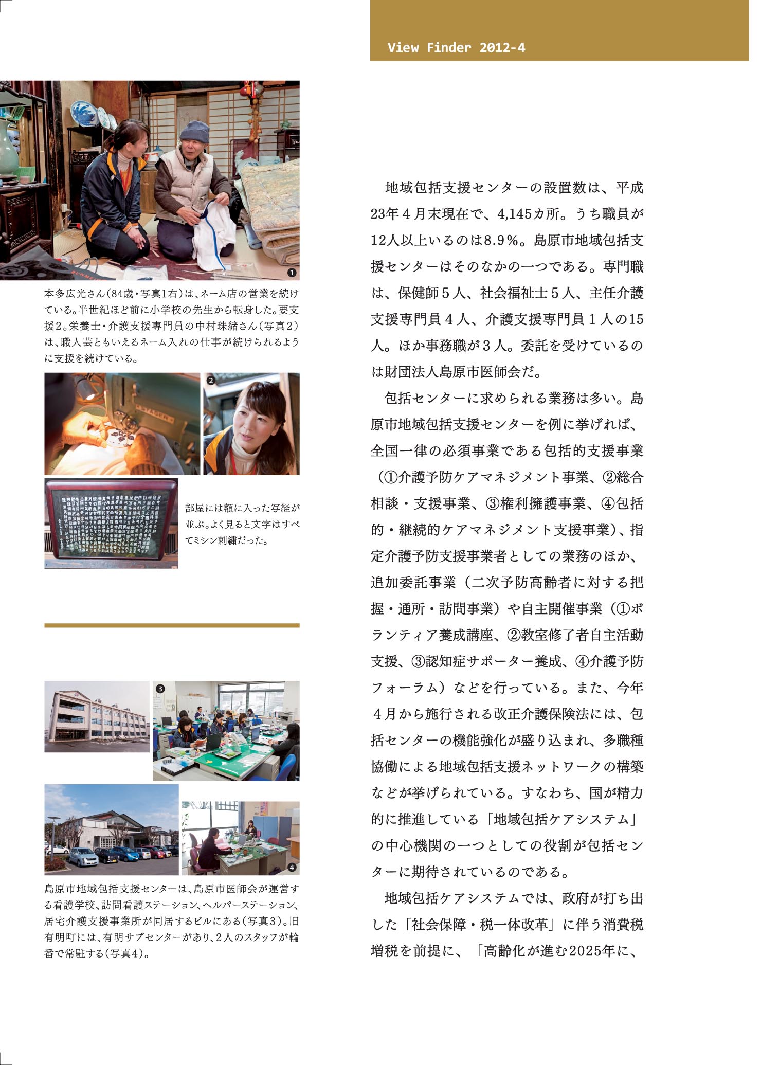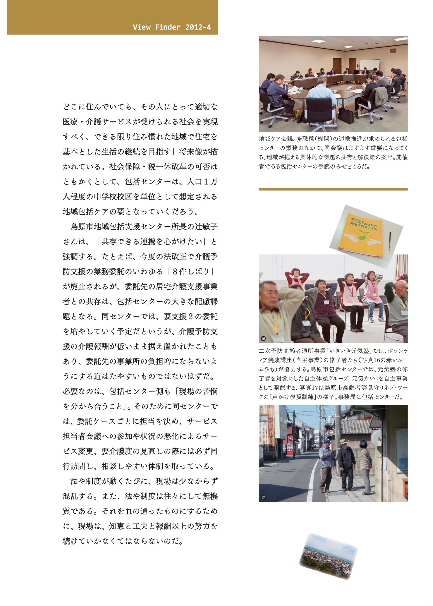 ケアマネジャー2012年月4号(中央法規出版発行) 「view-finder」に島原市 島原市地域包括支援センター様が掲載されました。 その1 その2 その3 その4 その5
